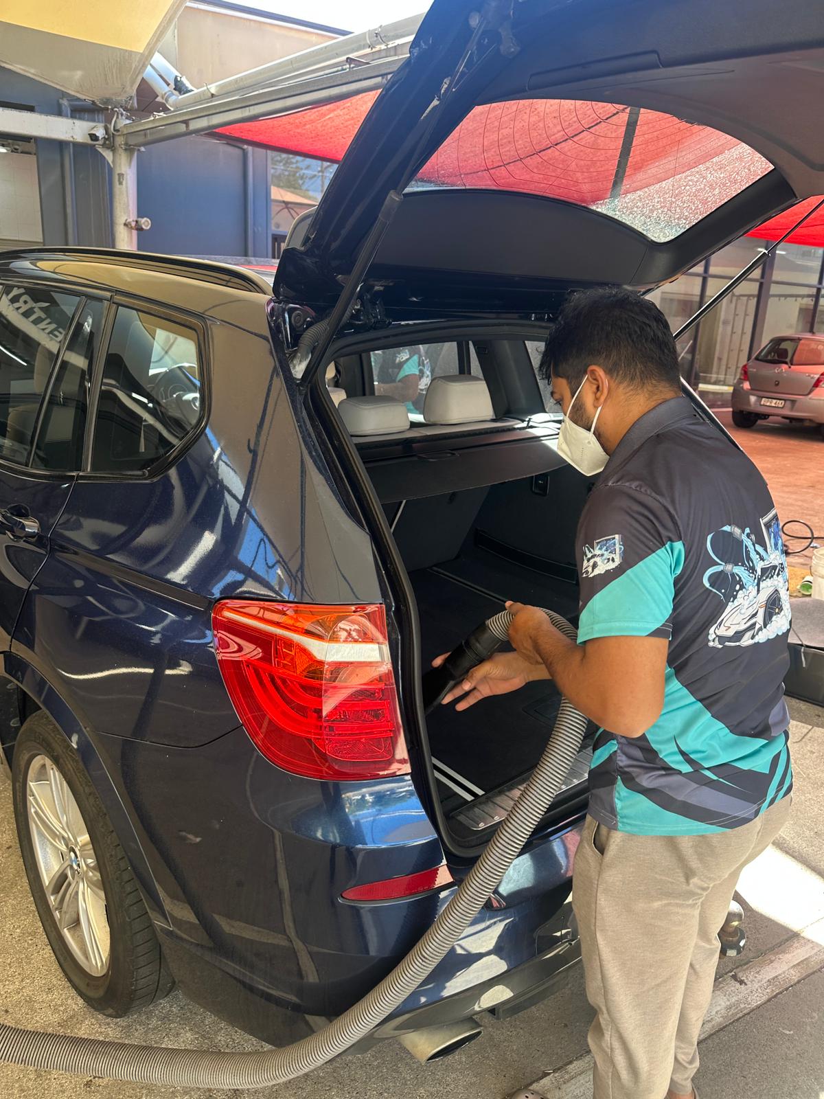 Comprehensive interior cleaning, including vacuuming, upholstery shampoo, and dashboard polishing for a fresh cabin feel.